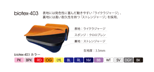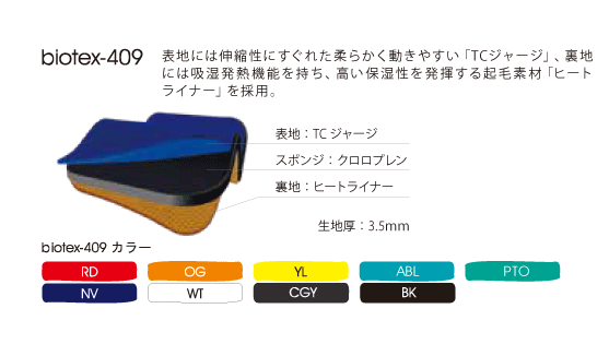 | 本体素材 | biotex-403(標準生地)、biotex-409(吸湿発熱生地)から選択 |